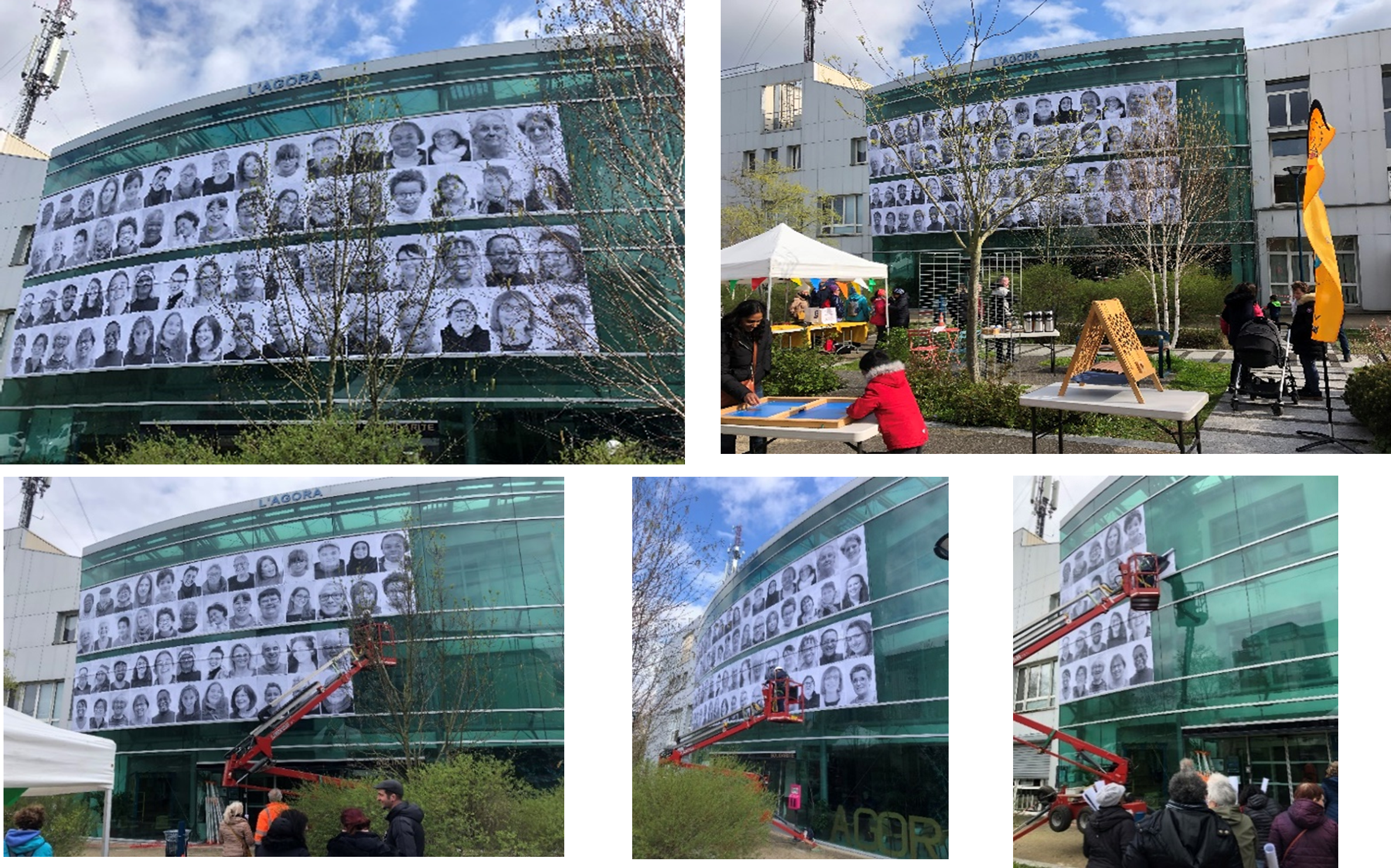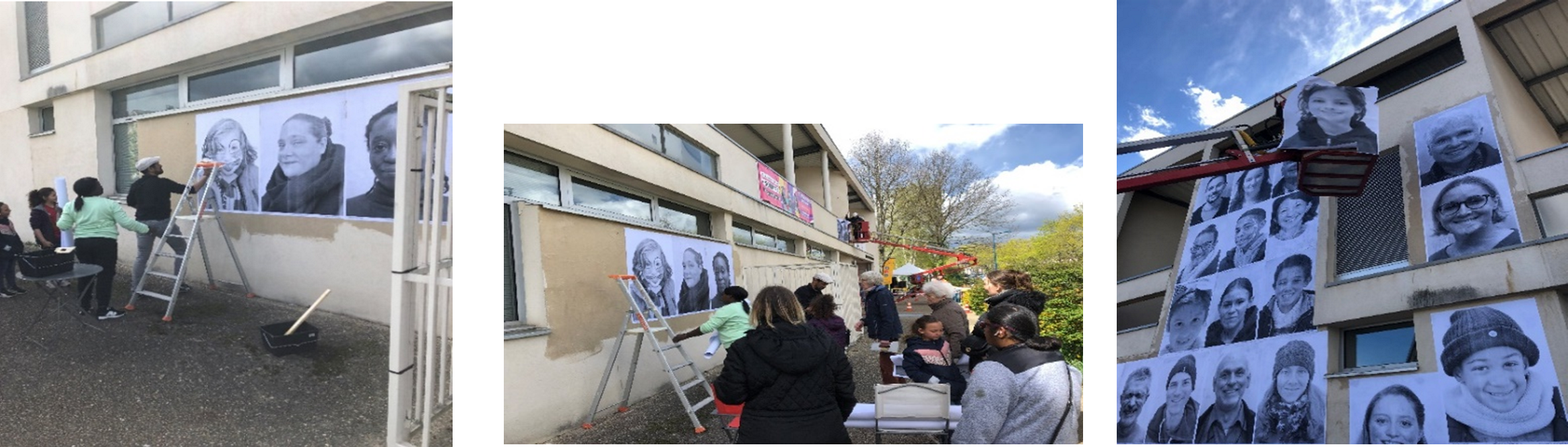 Plusieurs moments de prises de photos des habitants lors de différents moments d'animation sur la ville et lors de consultation des habitants hors les murs. Suivi par la suite de 2 journées de collages des portraits avec les habitants sur 2 quartiers de la ville (La Bibliothèque et le Centre Socioculturel situé en QPV).