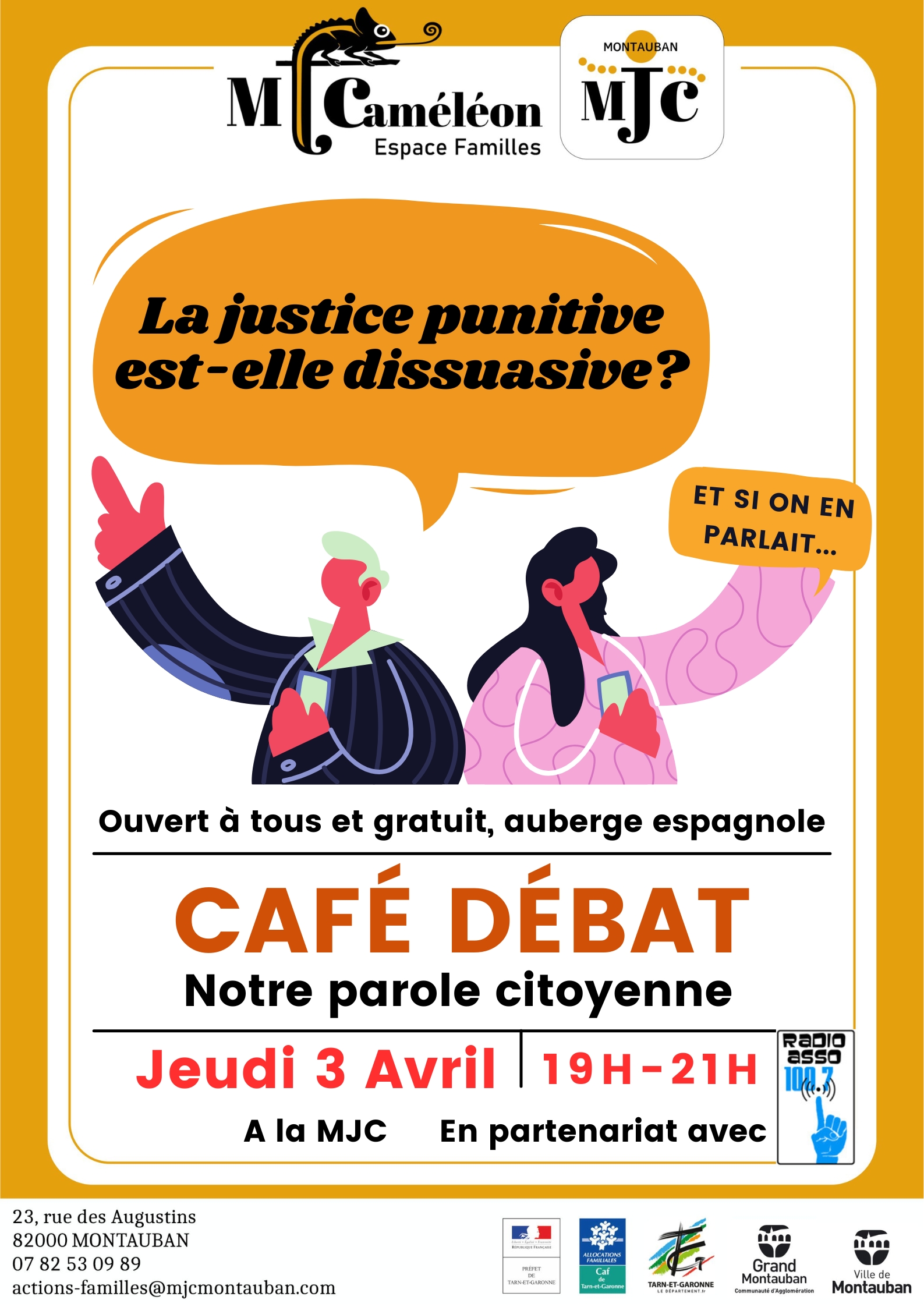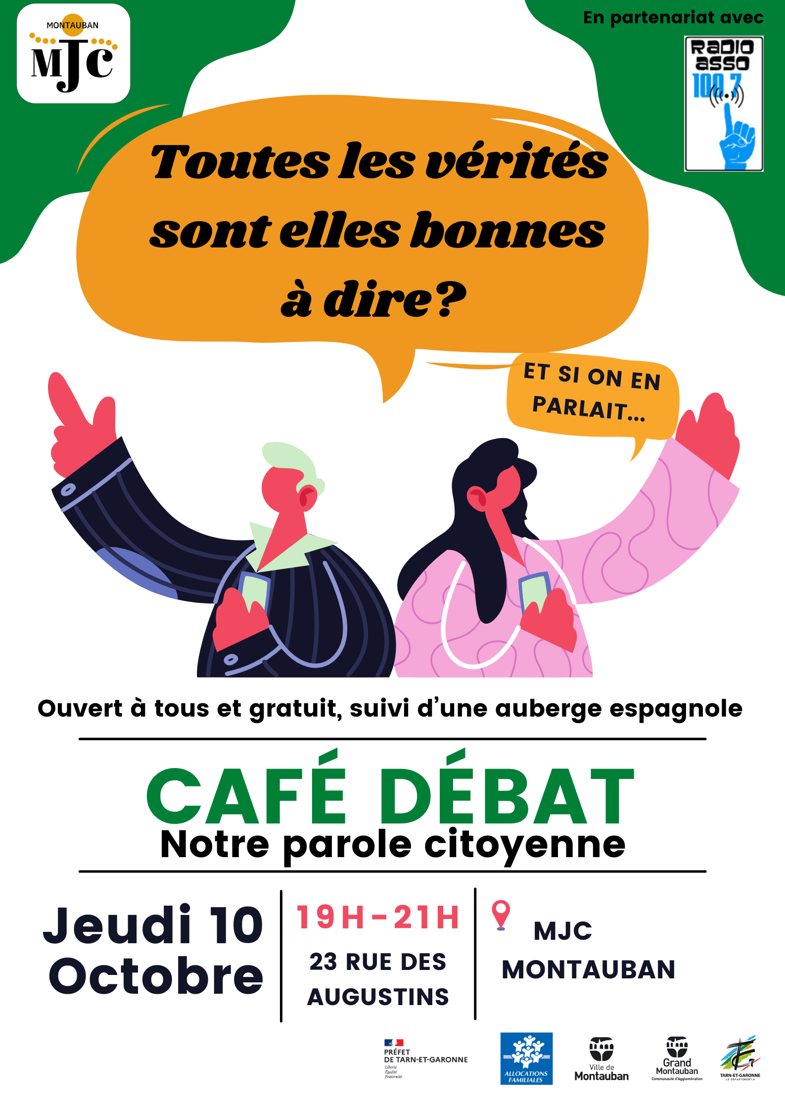 - Cette action existe maintenant depuis plus de 10 ans, a évolué et s'est développé au fil des années. Le café-débat a lieu le 2nd jeudi de chaque mois à la MJC. Le sujet est choisi par les participants en fin de séance pour la fois suivante. Nous avons décliné le projet avec des partenaires (le CS de Montauban), mais aussi dans les établissements scolaires,ainis que sous forme de ciné-débat en partenariat avec le cinéma arts et essai de Montauban.