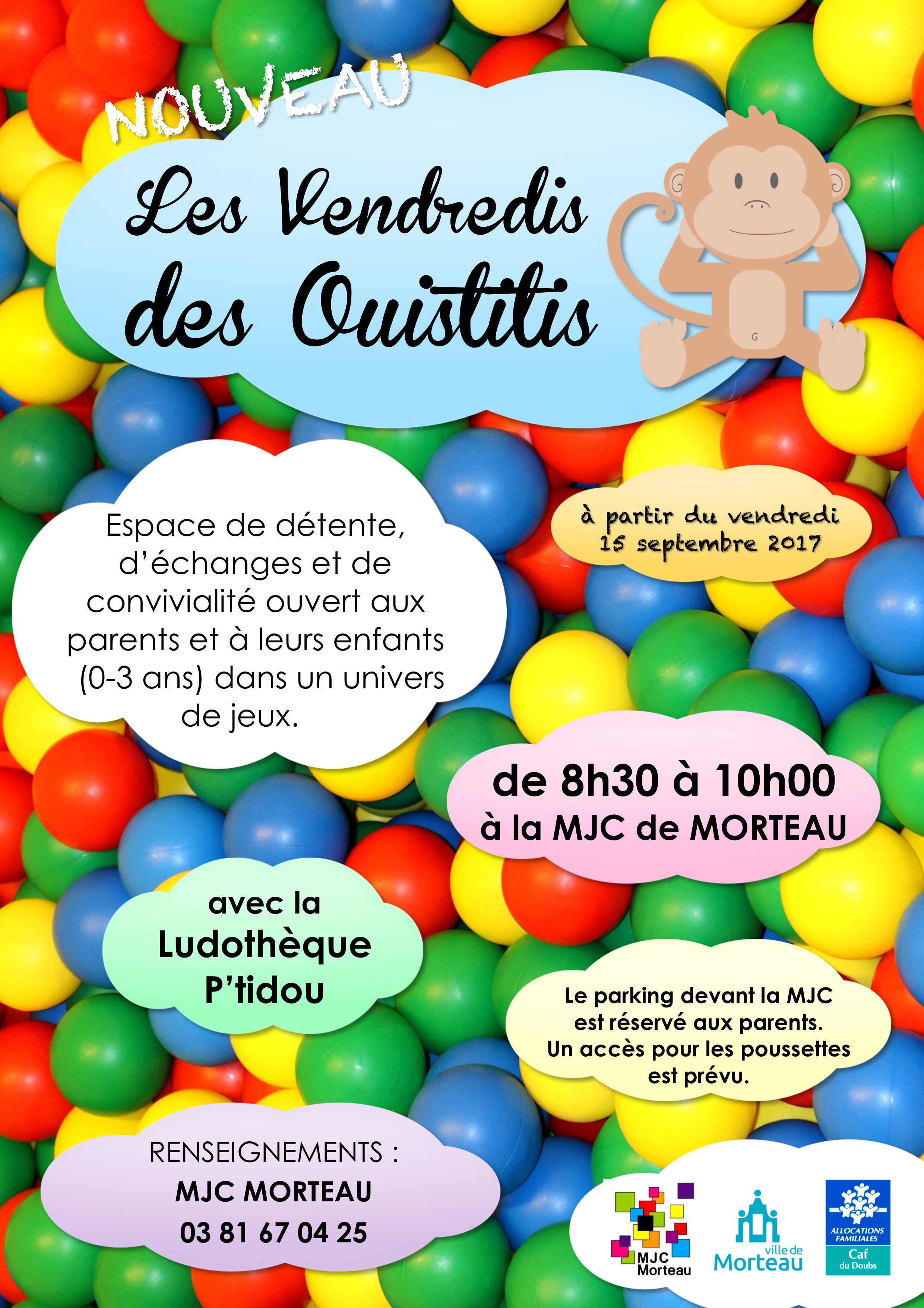 Les vendredis des ouistitis est un nouvel espace de détente, d’échanges et de convivialité ouvert aux parents et à leurs enfants âgés entre 0 et 3 ans. L’accueil des familles se fait dans un univers de jeux chaque vendredi (hors période de vacances scolaires) entre 8h30 et 10h (après qu’ils aient déposés leurs plus grands enfants à l’école).