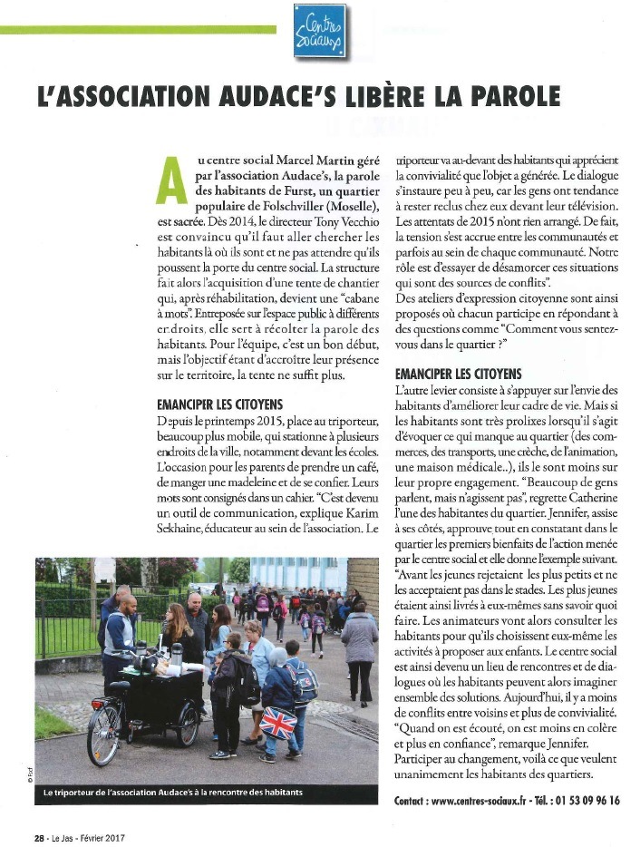 L’association Audaces’s a su tisser de la cohésion sociale sur le territoire. Au travers de cette animation innovante, la promotion des habitants de notre territoire a été reconnue par la Fédération des Centres Sociaux de France « Hors les Murs » et d’autres instances. Avec nos différents partenaires comme les Bailleurs, le Conseil Citoyen, le Département de la Moselle et les villes de Folschviller Valmont et d’autres cette action tisse un maillage au cœur du quartier QPV et de la ZUS.