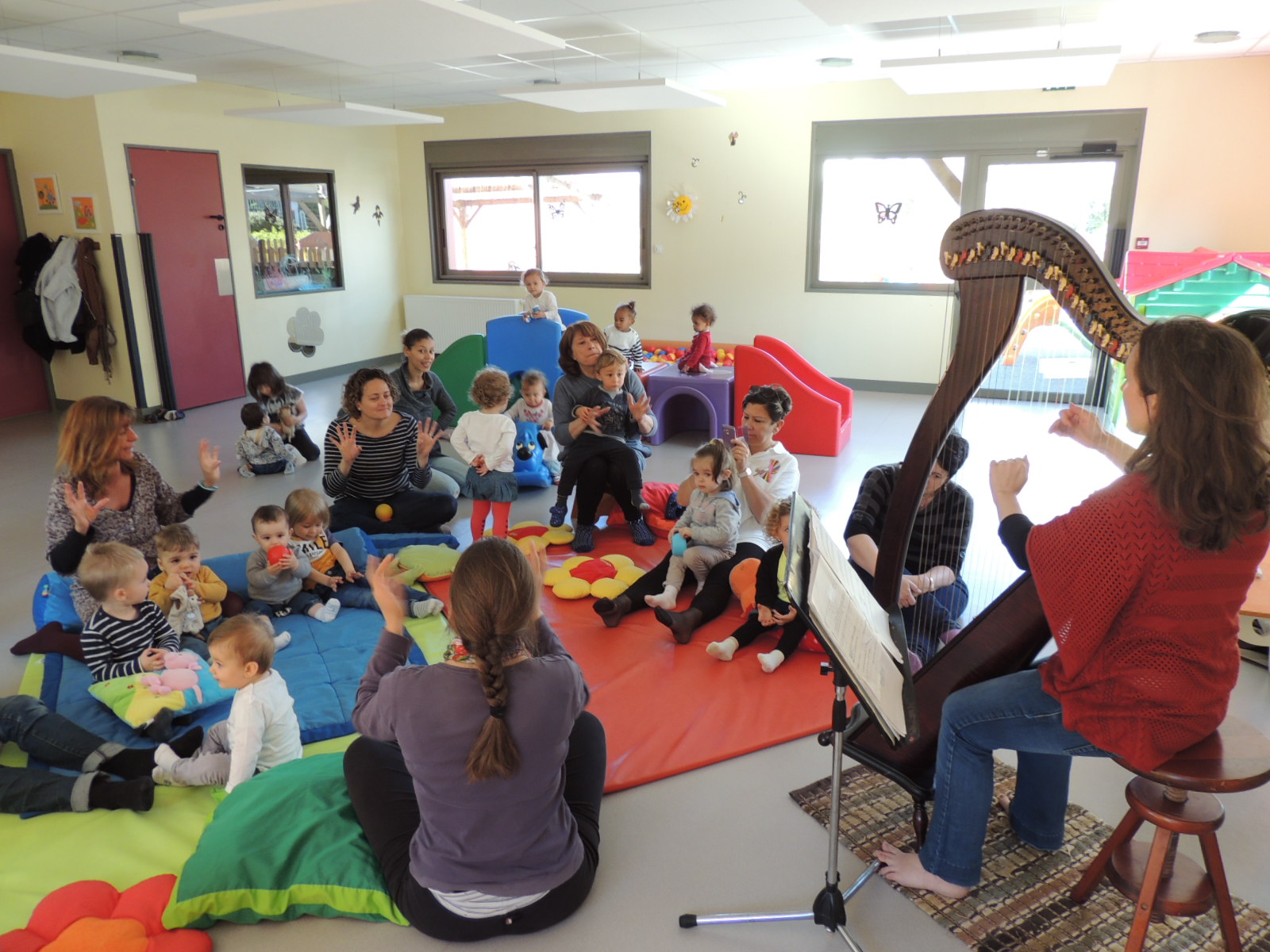 Il s’agit d’un atelier d’éveil parents-enfants de 0 à 3 ans qui a eu lieu le mercredi matin. Cet atelier est le résultat du travail d’un groupe de mamans ayant sollicité fin 2016 la référente familles pour créer un atelier hebdomadaire où elles pourraient partager un moment privilégié avec leurs tout-petits et, dans le même temps, échanger avec d’autres mamans sur des questions de parentalité.