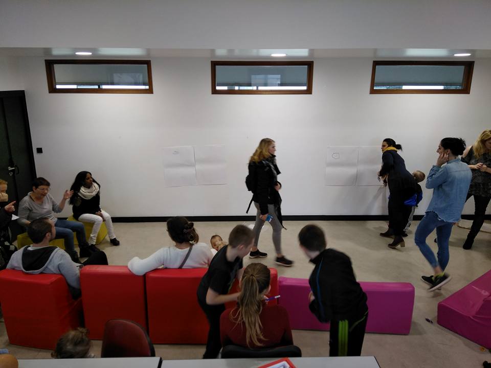 evaluation de la soirée par les parents sur une grande nappe papier (observations sur tout), affichage des évaluations par la suite au centre social.