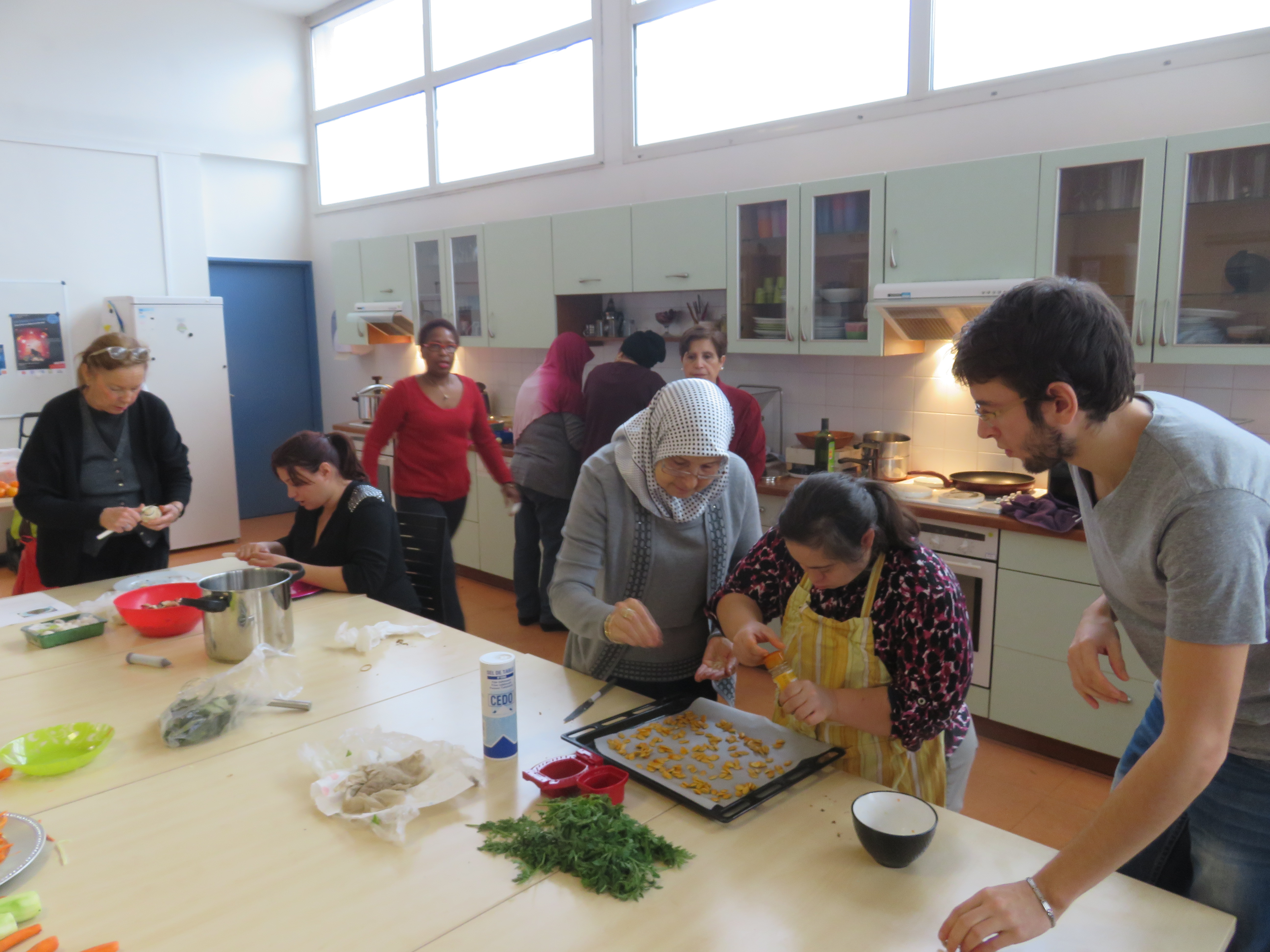 Les ateliers culinaires, support pour la création de lien social entre les habitants, sont une base pour effectuer un autre travail avec les participants. Durant ces temps, la professionnelle aborde des sujets comme le budget familial, l'éducation, l'actualité... avec les personnes lors de la confection des recettes culinaires et lors des temps conviviaux (accueil, pause café...).