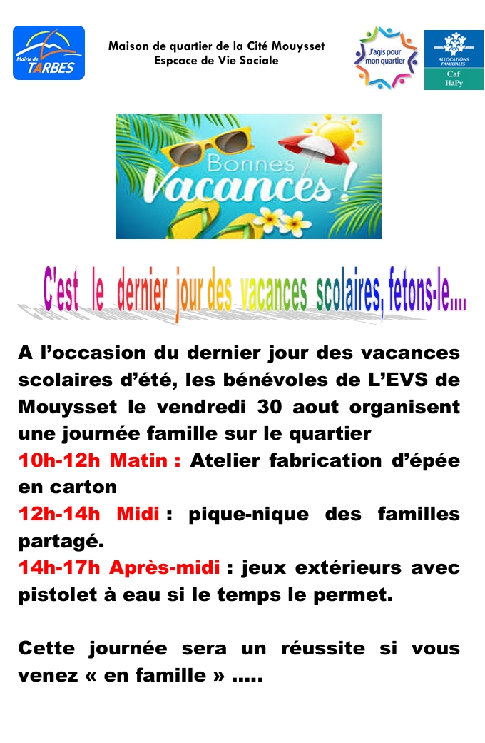 A l’occasion du dernier jour des vacances scolaires d’été, les bénévoles de L’EVS de Mouysset, le vendredi 30 aout, organisent une journée famille sur le quartier.
