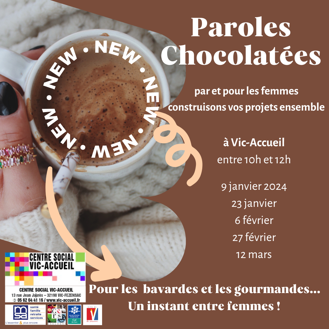 Paroles chocolatées: il s'agit de temps d'échanges autour d'un chocolat chaud (période octobre à mars) tous les quinze jours mis en place au sein du Centre social. Ouvert à toutes les femmes du territoire, il se veut un lieu bienveillant avec 2 accueillantes, coconning, d'échanges dans le respect de soi et des autres, de possibilités de contruire un projet ou une action défini de façon collective si possible avec les compétences du groupe