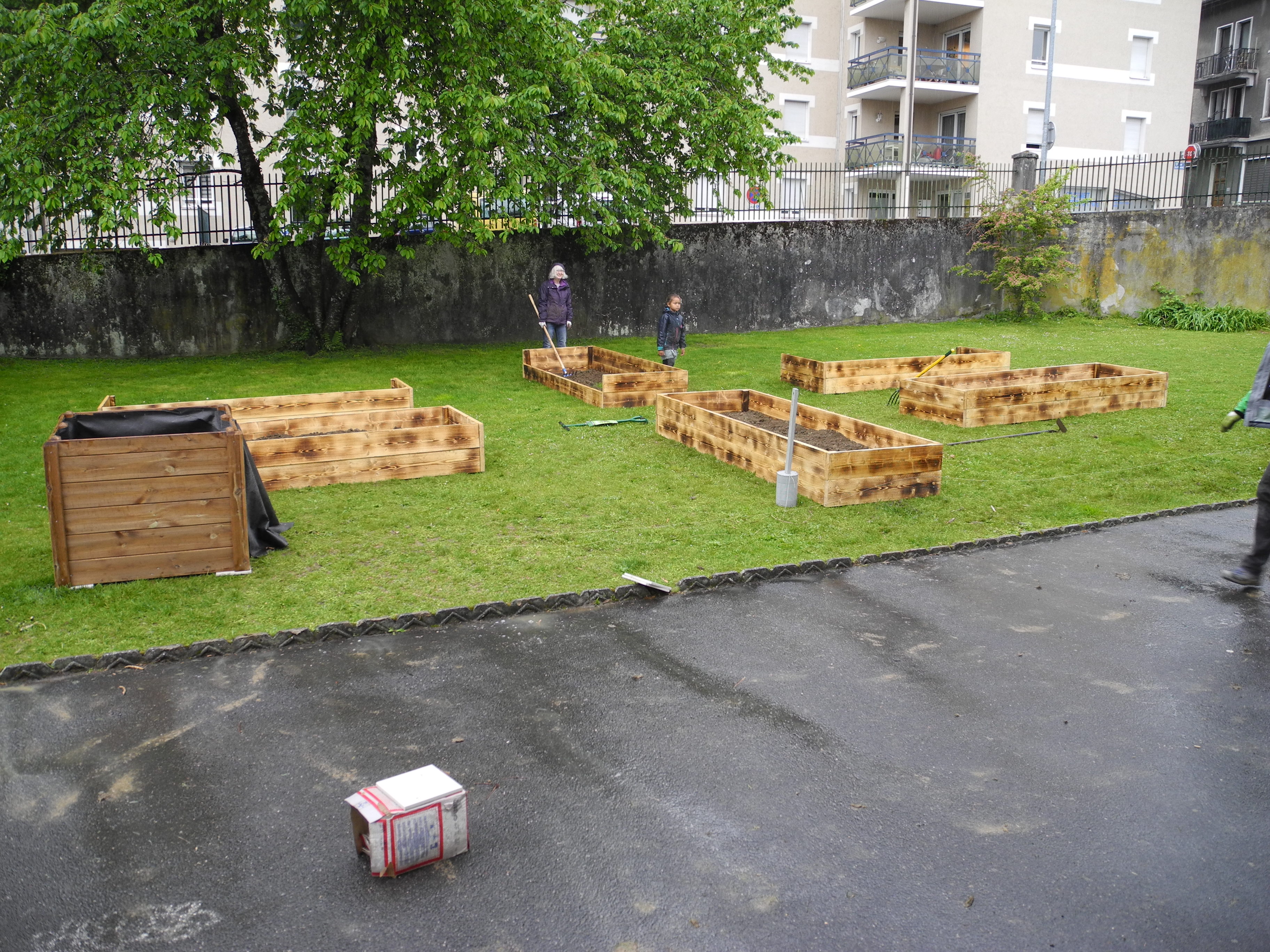 6 bacs ont été réalisés par les jardiniers permettant à tous les habitants de consommer la production (plantes aromatiques, tomates, courges…). Une inscription « servez-vous » et « incroyables comestibles » a été posée sur chacun des bacs. Ce sont les enfants de l’école Claires Fontaines qui ont été les 1ers à planter. Chaque enfant est reparti avec une invitation pour leur parent à venir découvrir le jardin.
